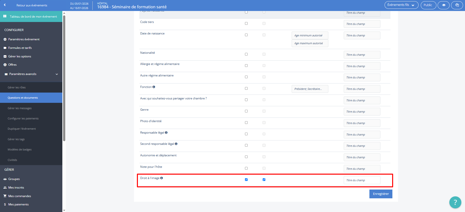 Pour activer la question du droit à l’image lors de l’inscription, rendez-vous dans Paramètres avancés dans le menu à gauche, puis dans Questions et documents. Vous trouverez l’option dans la partie Champs optionnels.
