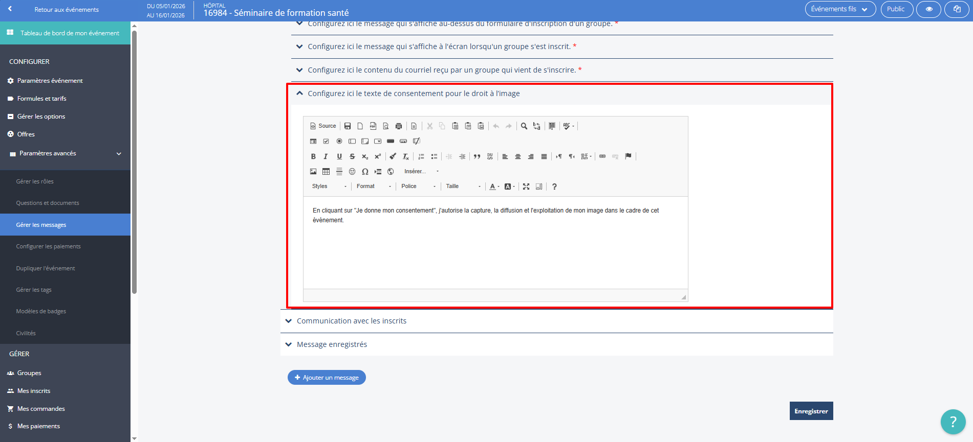 Pour ce faire, toujours dans Paramètres avancés, allez dans Gérer les messages et cliquez sur Configurez ici le texte de consentement pour le droit à l’image :