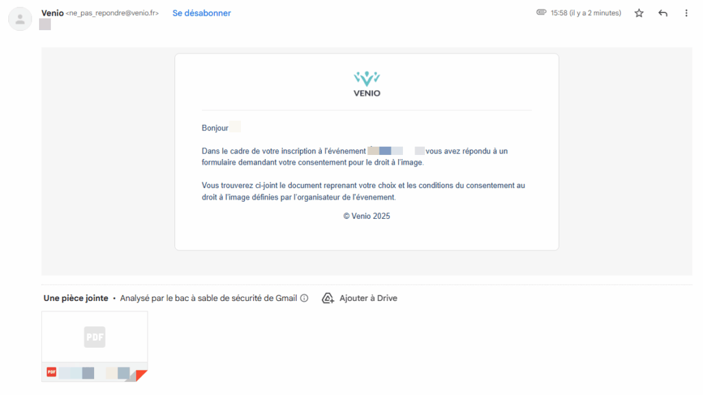 Après leur inscription, vos participants recevront un e-mail spécifique confirmant l’accord (ou le désaccord) qu’ils ont donné :