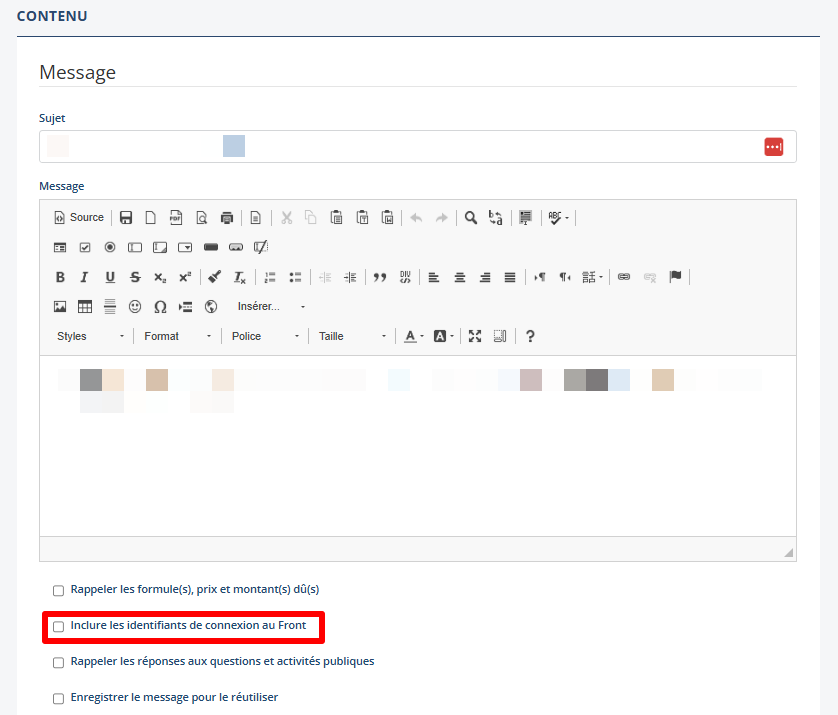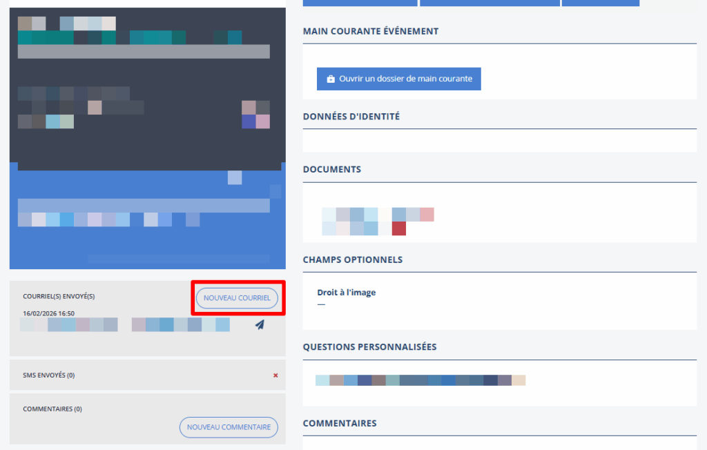 Si vos inscrits ont besoin de récupérer leurs identifiants, vous pouvez leur renvoyer : rendez vous dans Mes inscrits dans le menu à gauche, puis ouvrez la fiche du participant en question en cliquant sur l’œil au bout à droite de son nom. Dans la fiche, cliquez sur Nouveau courriel puis cochez Inclure les identifiants de connexion au Front.