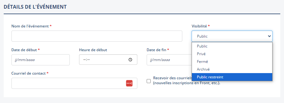 Dans certaines situations, vous pouvez être amené à vouloir organiser un évènement privé avec une liste restreinte d’inscrits. Pour cela, vous pouvez sélectionner la visibilité Public restreint à la création d’un évènement.