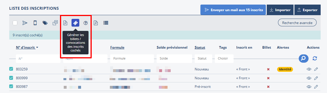 Vous pouvez générer les billets et les convocations en vous rendant dans Mes inscrits et en cliquant sur le pictogramme vert (re)Générer un billet ou (re)Générer une convocation, ou en sélectionnant les inscrits souhaités et en cliquant sur le pictogramme Générer les billets/convocations des inscrits cochés.