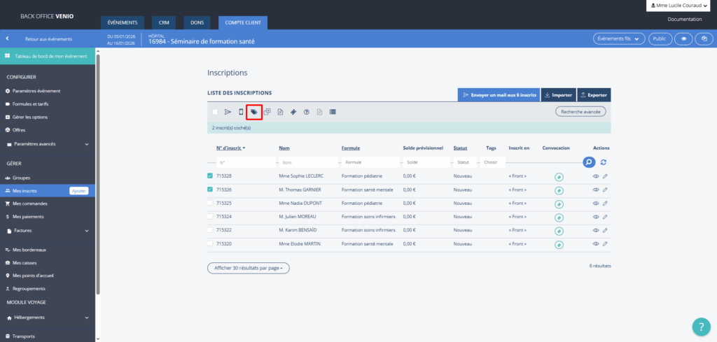 Dans le menu à gauche, cliquez sur Mes inscrits. Sélectionnez les participants auxquels vous souhaitez attribuer un tag en cochant la case à gauche des numéros d’inscrits.