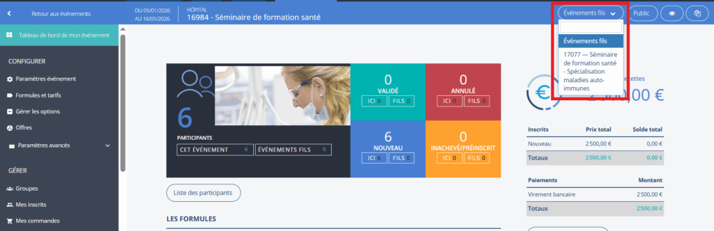 Depuis votre événement père, vous pourrez désormais voir les événements fils créés :