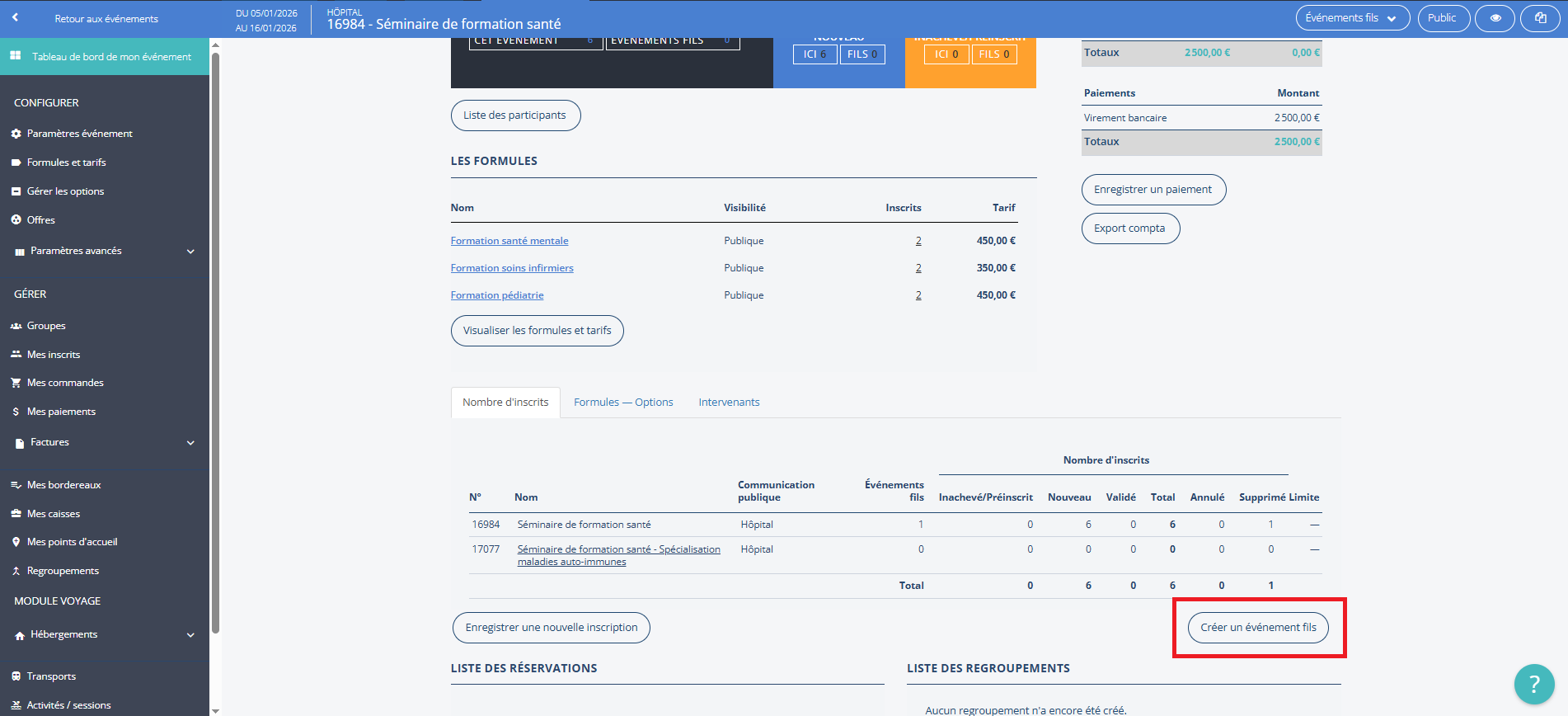 Pour créer un événement fils, allez sur le Tableau de bord de l’événement qui doit être père.