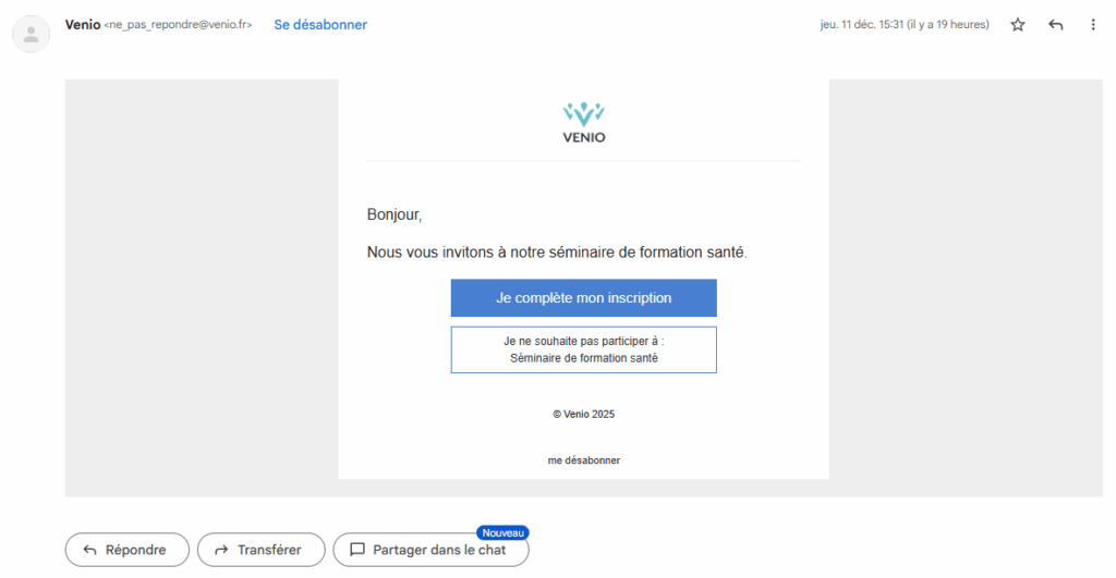 Vos participants recevront un e-mail comme ci-dessous, avec votre texte et un lien vers votre événement ainsi qu’un autre lien pour refuser l’invitation :