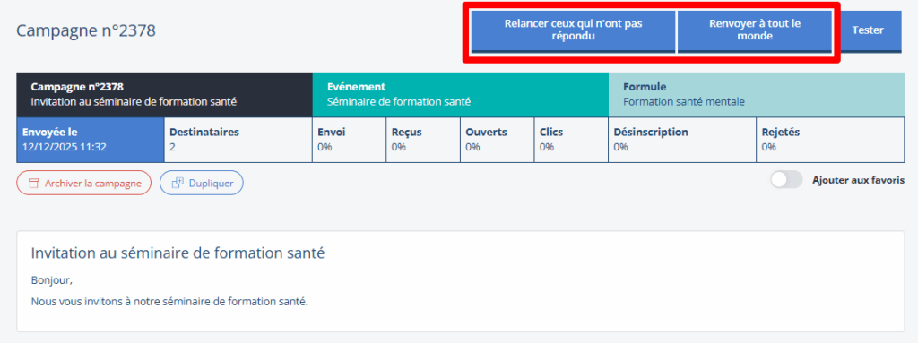 Si vous cliquez sur Relancer ceux qui n’ont pas répondu, vous pourrez modifier le corps de texte de l’e-mail ainsi que dans l’objet pour adapter votre message. Cela créera une nouvelle campagne qui sera reliée à la première.