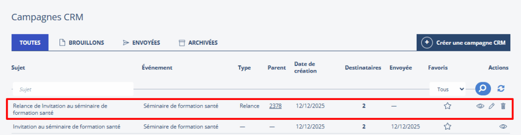 Grâce au module CRM, vous avez accès à des informations concernant votre campagne qui vous permettent de pouvoir, par exemple, renvoyer la campagne aux participants qui n’ont pas répondu :