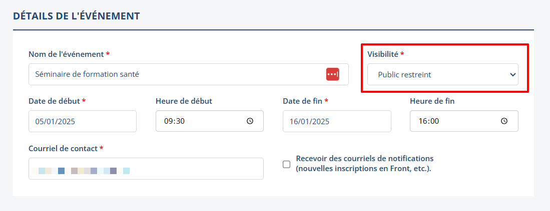 Pour restreindre un événement, rendez vous dans Paramètres événements dans le menu à gauche. Dans les détails de l’événement, modifiez sa Visibilité en sélectionnant Public restreint.