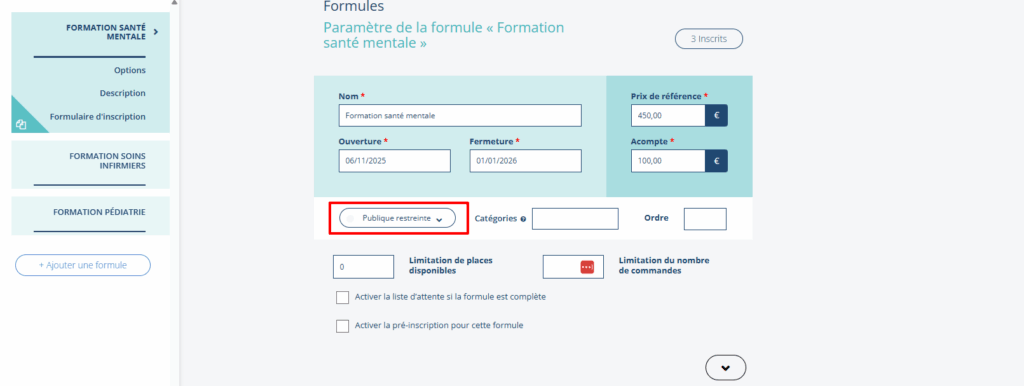 Pour restreindre une formule, rendez vous dans Formules et tarifs dans le menu à gauche, choisissez la formule que vous souhaitez restreindre ou créez la, puis passez la en Publique restreinte dans les paramètres.