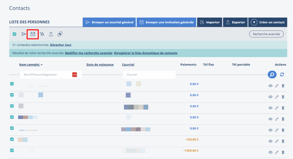 Cliquez sur la case pour cocher tous les participants qui s’affichent – ils appartient tous à la catégorie de ciblage. Cliquez ensuite sur le pictogramme Inviter la sélection à un événement.