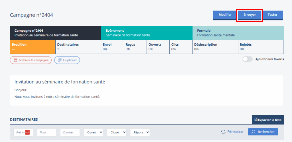 Vous pouvez maintenant créer la campagne. Pour la lancer, cliquez sur Envoyer sur la page principale :